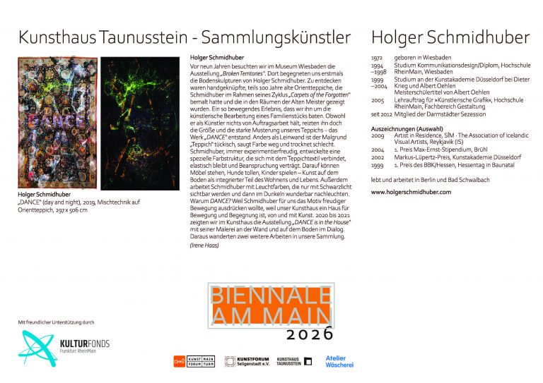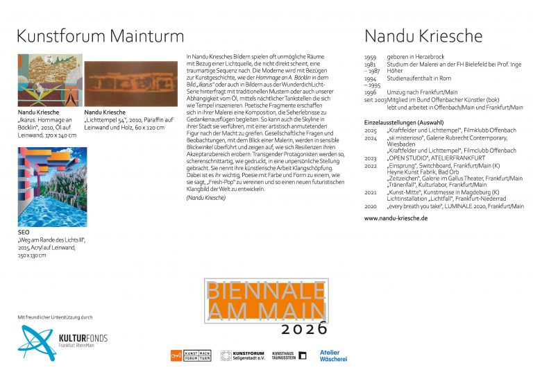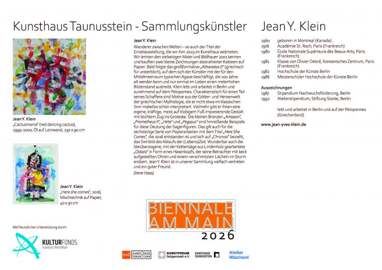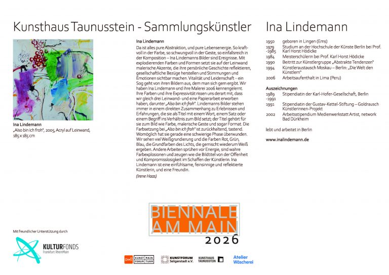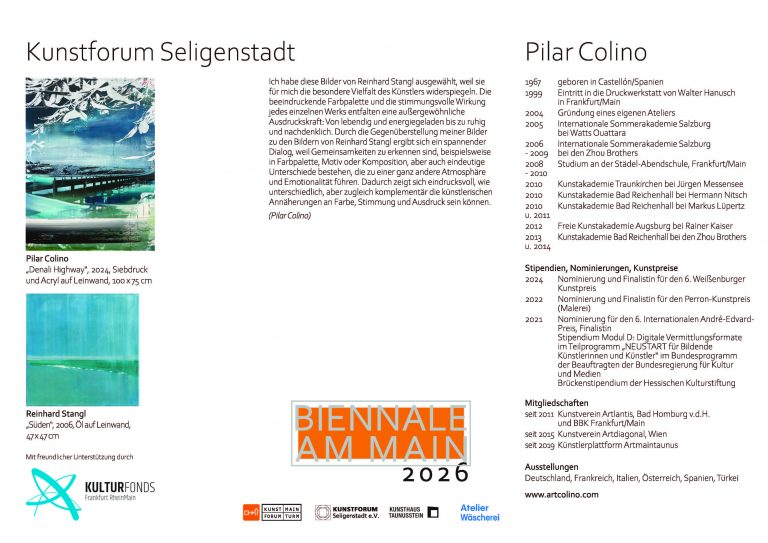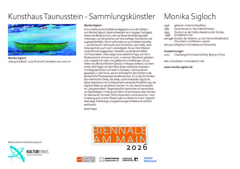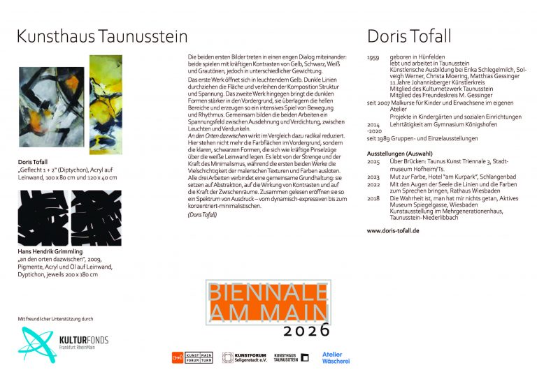 mit dem Ausstellungsprojekt „Biennale am Main“ dokumentiert die Stadt Flörsheim am Main seit 2024 ihre enge Einbindung ins Rhein-Main-Gebiet als vielfältige und bedeutende Kulturregion im Herzen Europas.
