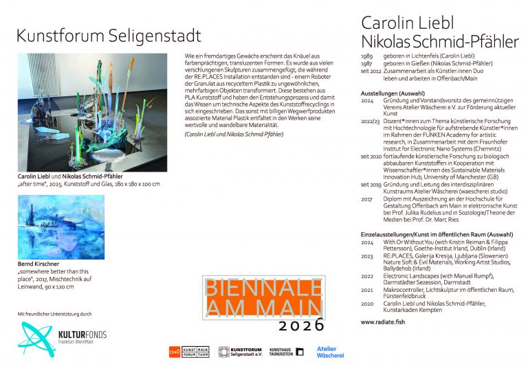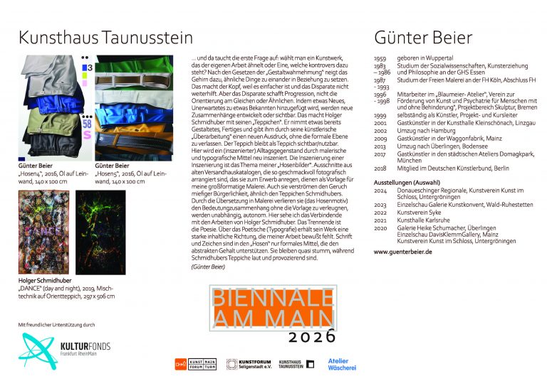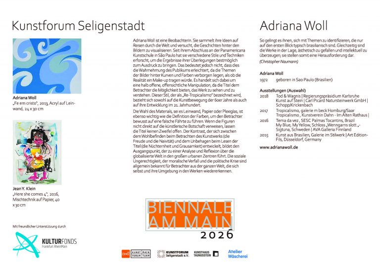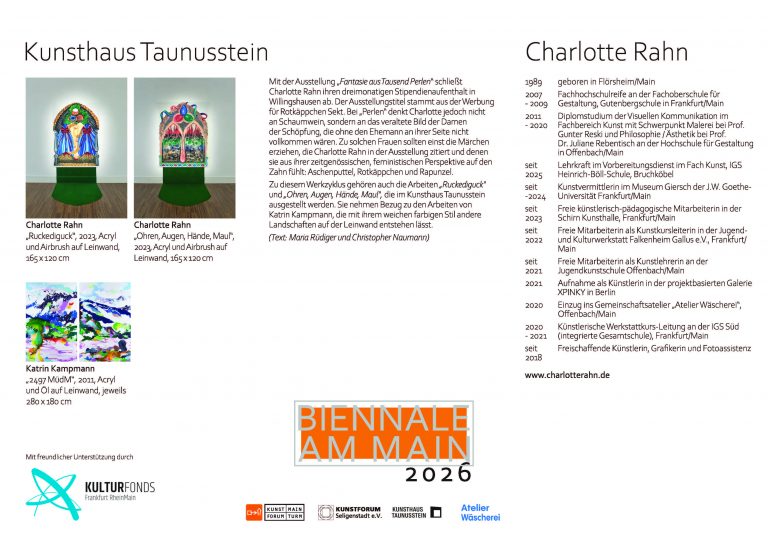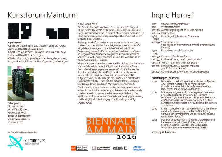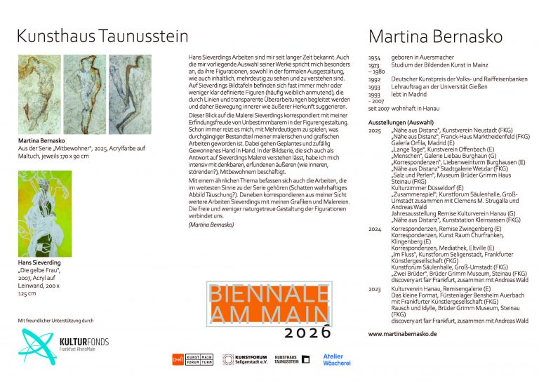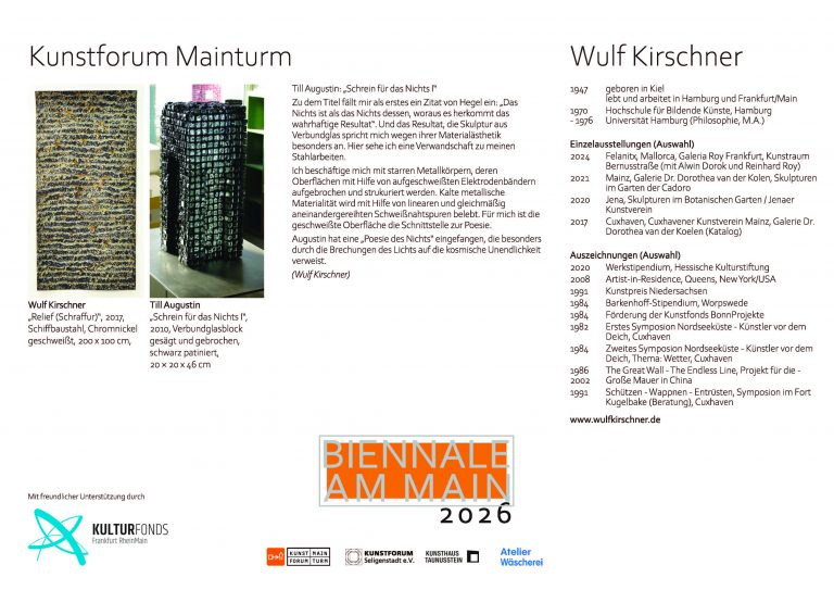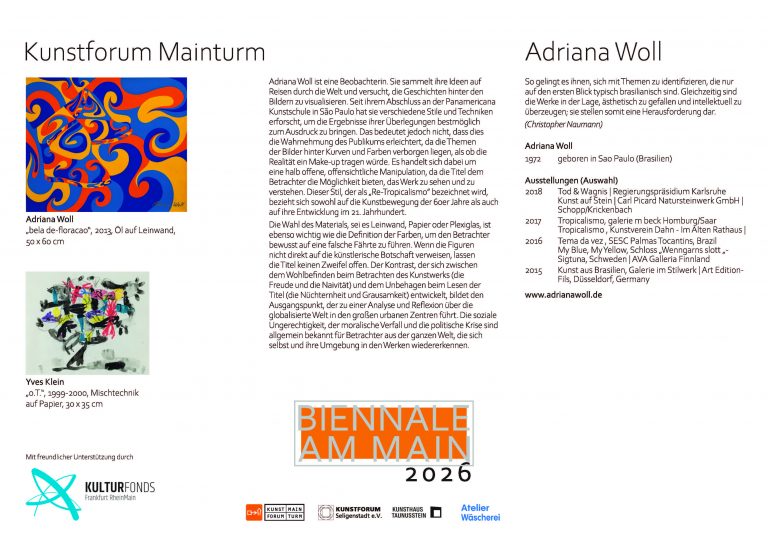 mit dem Ausstellungsprojekt „Biennale am Main“ dokumentiert die Stadt Flörsheim am Main seit 2024 ihre enge Einbindung ins Rhein-Main-Gebiet als vielfältige und bedeutende Kulturregion im Herzen Europas.