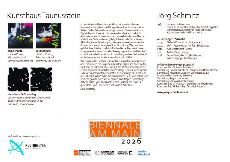 Dabei freue ich mich in diesem Jahr ganz besonders über die enge und kreisübergreifende Zusammenarbeit mit den Ausstellungspartnern in Taunusstein, Offenbach und Seligenstadt. So zeigt die Biennale am Main auch 2026 wieder eindrucksvoll auf, welch ambitionierte Projekte durch gezielte Kooperationen zwischen unterschiedlichen Kommunen und Organisationen auf die Beine gestellt werden können. Ein Dank sei hier ausdrücklich auch allen Sponsoren ausgesprochen, besonders dem Kulturfonds Rhein Main.