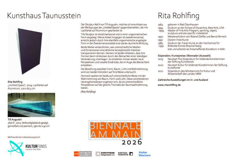 Das Kunsthaus Taunusstein, die Kunstforen Seligenstadt und Flörsheim sowie die Ateliergemeinschaft Wäscherei in Offenbach sind die Protagonisten der Biennale am Main 2026.